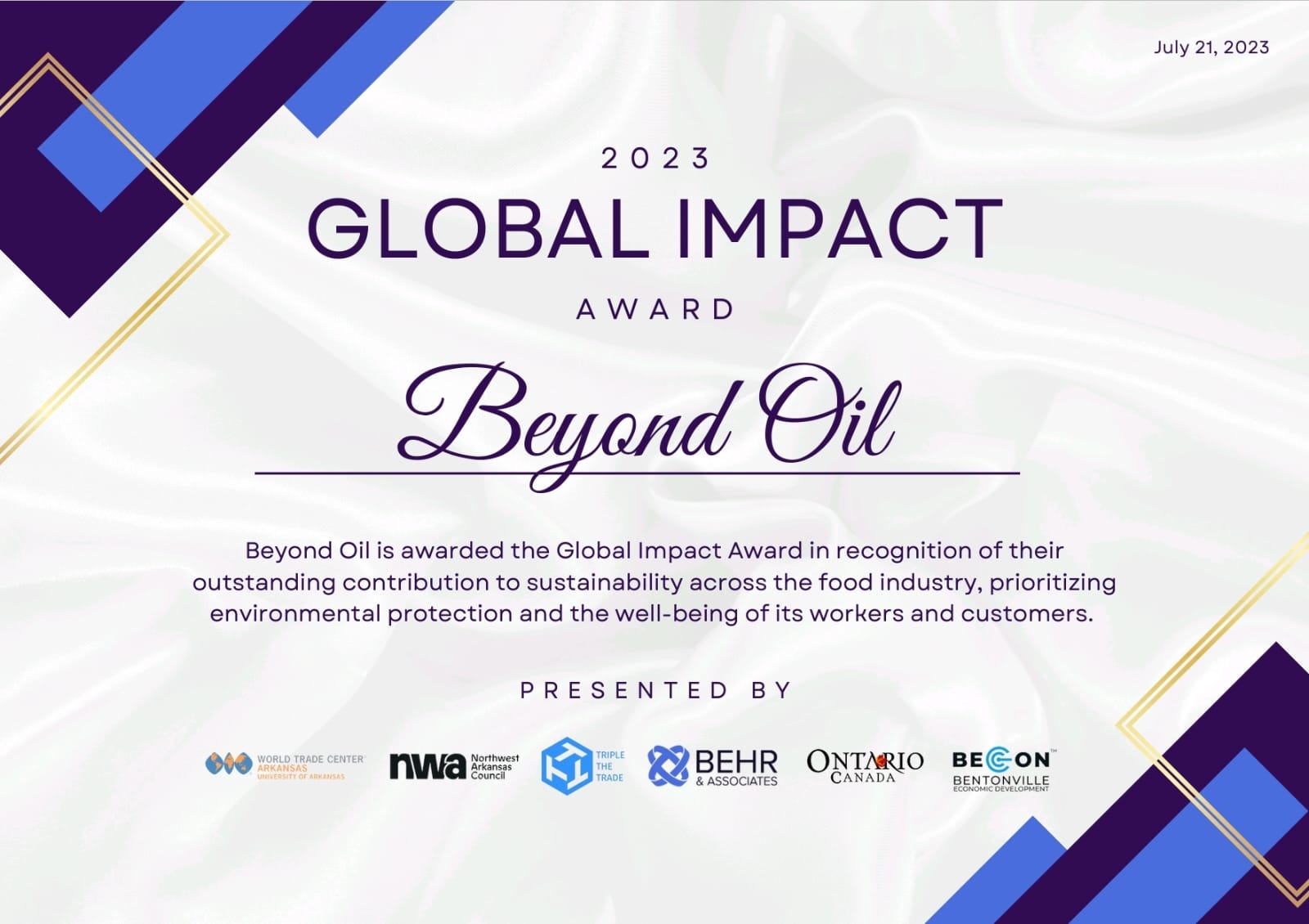 We are thrilled to announce that Beyond Oil has been honored with the prestigious Global Impact Award for 2023, a testament to our commitment to sustainability and innovation within the food industry. This award is a recognition of the significant, sustainable, and scalable impact that our business and initiatives have driven.